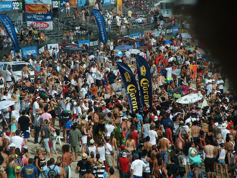 浪费了个把种头, 但也算看个热闹吧, 转头去BOLSA CHICA, 下水冲了2小时, 浪还不错 , 人虽然不少,但是比起开放的海滩好很多了,至少还有车位.最后不慎把脚后跟在新的 FIN上面割破了,本来还不知道,上岸了才发现的,好在没把鲨鱼引来. 问LIFEGUARD讨了个膏药贴上,这里赞一下LIFEGUARD,很敬业,态度也和善, 记得在国内 做救生的时候都光顾着喝斥违规的人了,人实在太多了,不过对MM一贯态度和善. 然后冲一把,换上自行车直奔HUNTINGTON PIER,这是计划,下午两点半是长斑决赛,三点 短斑决赛,而且那里是不可能找到停车位的. 骑过去也就十来分钟,果然不出所料,PPL MTN PPL SEA,