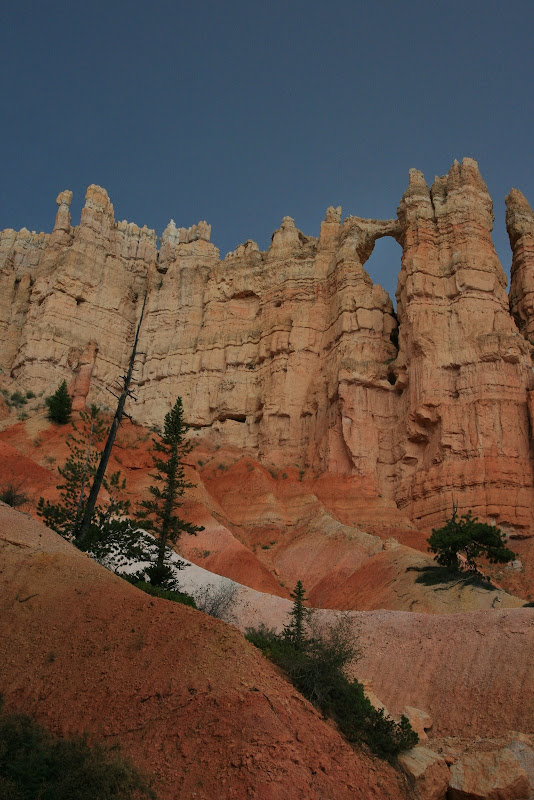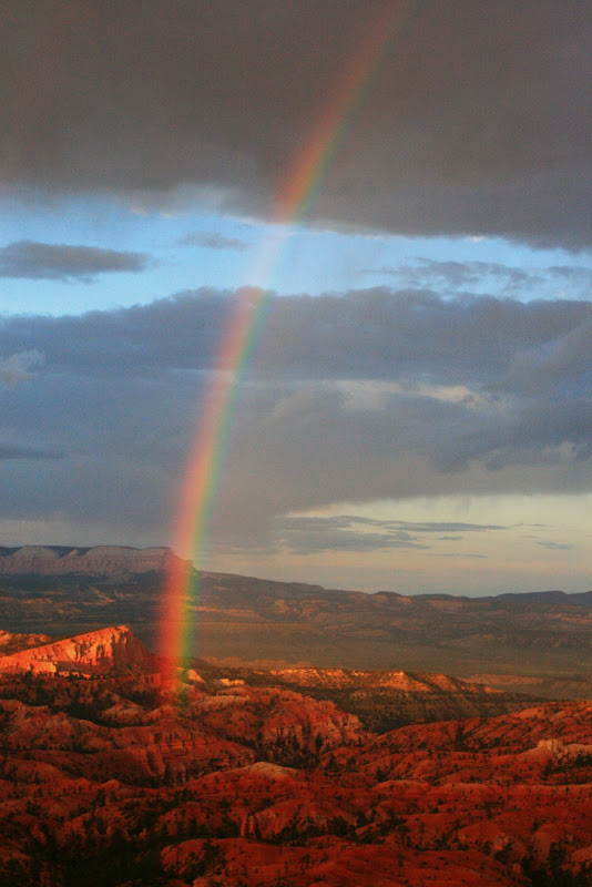 日暮时分,俄们才真正体会到了这句话的价值, 乌云散开, 太阳居然有露出了头, 把万 道金光直射到对面的山头上,一架彩虹,一个巨大的,完美的,无以伦比的彩虹,甚至是双 层彩虹,横架在山谷间的粉红色的HOODOO石柱群上,只有这样宽广的山谷才能有这么完整 的彩虹,也只有这么美丽彩虹配的上这完美的日落景色,不夸张的说,俄陶醉了.