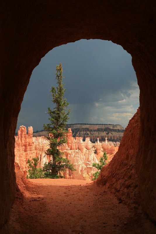 七月五号那天,天热得发了狂。太阳刚一出来,地上已象下了火。 话说俄们离开ZION穿过隧道,饶过棋盘山, 俄们向BRYCE CANYON出发, 北方越来越厚重 的积雨云预示着什么,果然不出所料,到了HATCH小阵的时候,路边的树象是得到了什么讯 息,开始摇动起来,还没等人明白过来,大雨已经狂泼下来,雨水大到用最大挡雨刮也无法 看清楚前方的路,只能赶快停在路边的一个加油站,不约而同的好几个车都停在了这里, 很多人拥挤着,打开车门,就是一个寒站,车外的气温至少猛然间降低了十几度,千万条水 落下来, 周边已经看不清什么景致了,只有一片混沌的水世界.