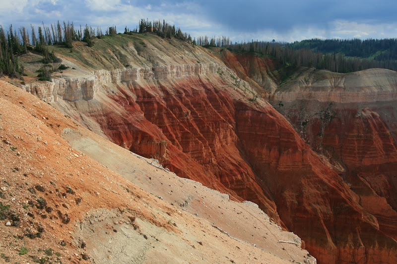Cedar Break NM在14号公路上,本来俄们打算从BRYCE CANYON走143直穿过去,但是天上 依然乌云密布,时不时的从天到地直劈下一道道闪电,可能都无法下车看什么风景,加上 143似乎不是干道,为安全起见,走了89转14,上了14便一路上山,一直爬上一万尺, 难怪 去的人绝少,即使是夏天,路上车辆也是廖廖.