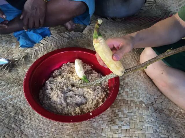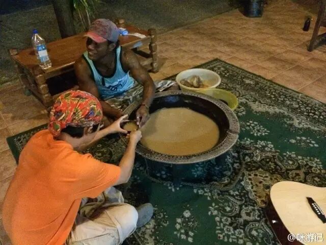 当地村民的生活自给自足,Tom的菜园里也应有尽有,餐桌上的食物全都来自自家的院子里。在Tom的园子里我们还看到了卡瓦()树,不得不提瓦努阿图有种非常特别的饮料叫卡瓦(Kava),就是用卡瓦树的块根制成,外表看来象泥浆,味道辛辣似胡椒,一杯下肚舌头发麻,外乡人恐怕颇难消受,却被瓦努阿图人视为国饮,相信它给人们带来身心幸福。瓦努阿图种植卡瓦已有上千年历史,当地人习惯晚餐前来一杯,在类似微醺的感觉中放松心情,一天的疲劳已无影踪。虽然在其它南太平洋国家比如斐济也都能喝到卡瓦,但是瓦努阿图的味道最为浓烈。据说常饮卡瓦中含有的活性物质有安神之功,可以治愈焦虑症和抑郁症。如果有好客的当地人递上一碗卡瓦,请务必庄重捧过,凝神静心,一饮而尽。