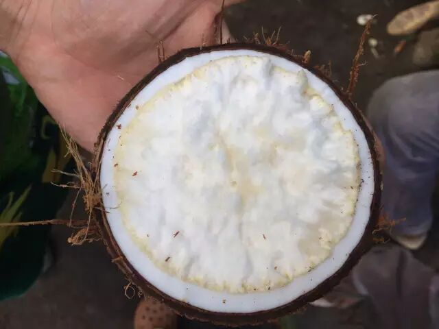值得一提的是,椰子开始发芽后,内部水会排出而椰肉会膨化充满整个椰壳,这叫做椰子笋,我们吃了好几个椰子笋。剩余的椰子肉比较油,可以用来当防晒霜。