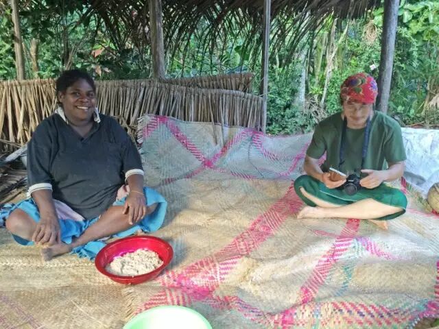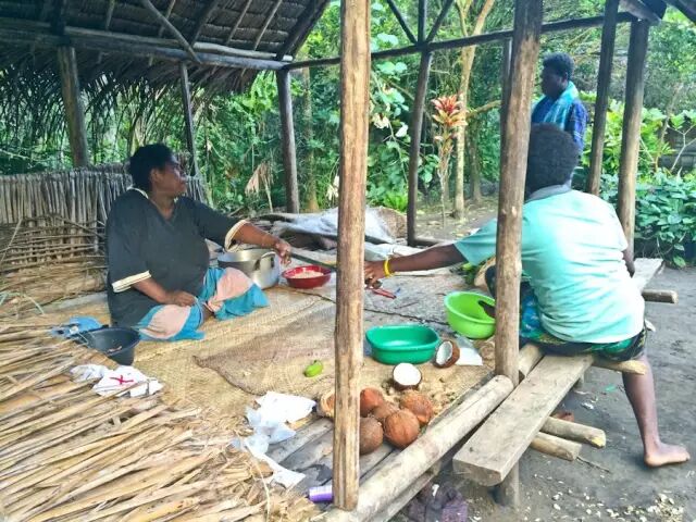 在Tom家的客厅,一个茅草顶亭子,一家人坐在凉席上,爸爸削椰丝,妈妈捣香蕉泥,小朋友倚在大人身上,大公鸡在边上走来走去,场面可爱,其乐融融。也许吃什么并不重要,共度的时光才是最珍贵的。我们也很开心帮着一起准备食物,体验一下当地生活。