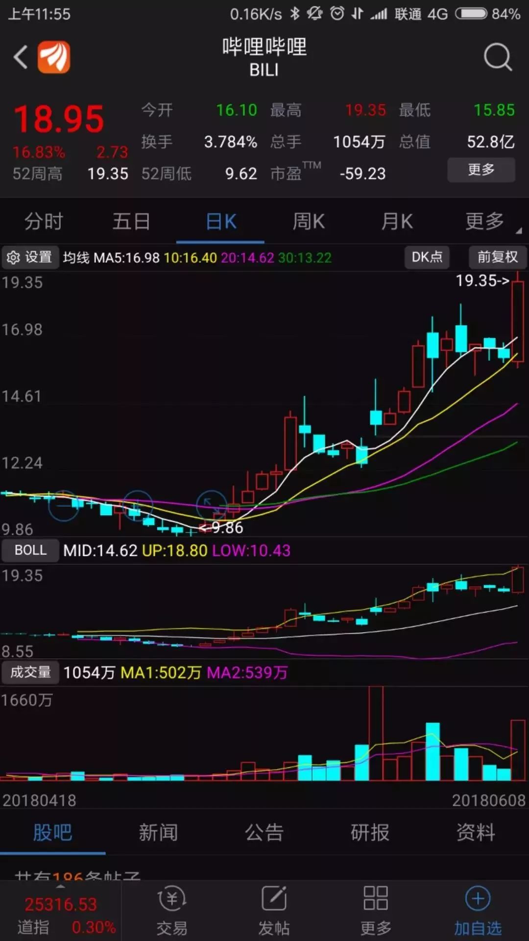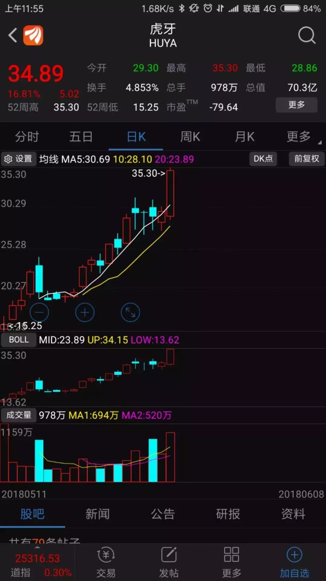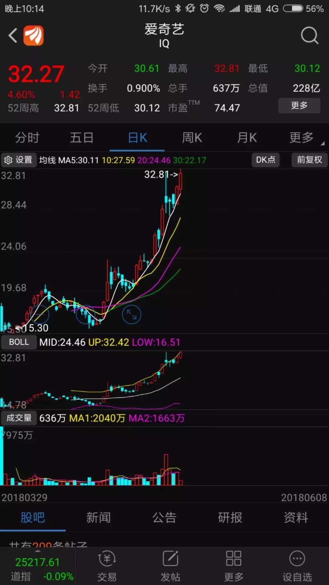 爱奇艺这几星期以来,从15涨到32,基本上翻倍了。这也是在美国上市的一个新股,第一天发行就直接破发了,包括虎牙和bilibili,在美国第一天上市就都破发了。爱奇艺这只股票自从二次探底15元之后,细心看这个股票技术图形的朋友,你就会发现,爱奇艺这几十个交易日,每一次都是大涨后出现回调,然后回调不破5日线,又涨上去,这样的态势一直持续到现在,依旧是5日线没破过。每一次回调,一到5日线上面就金针探底,一直到现在,这支股票都没有破位。对于持有这个股票的朋友,目前如果是按照5日线原则,依然可以继续持股,此股票的上涨趋势目前没有改变。等到他哪一天“真正破位”了5日线,(是真正意义上破位了5日线,跌穿且短期内收不回来的,如果跌穿了第二天或者第三天收回来的那种不算是真正破位5日线),那就是这个股票该出局的时候了。