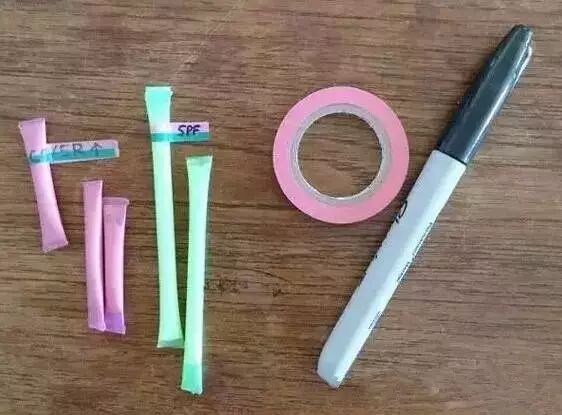 巧用吸管,让所有的乳液、护肤品、洗面奶量化到吸管里。最后不要忘记用彩色贴纸标注清楚里面装的是什么。