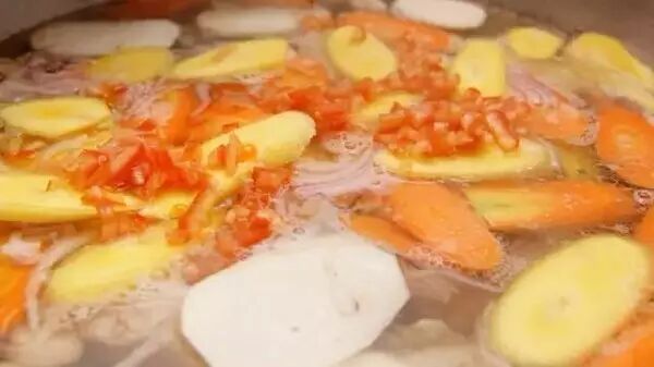 第六步:水开后,根据口味加入其他调味品,盖好锅盖炖,直到胡萝卜和羊肉都熟。