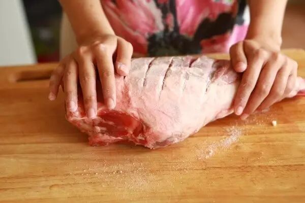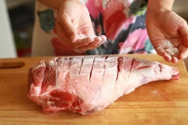第二步:用手给羊腿按摩,来回摩挲,使盐渗入羊腿(两面都要做)。