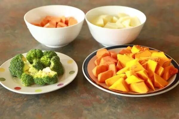 第五步:将土豆,地瓜,南瓜,胡萝卜去皮,切成块.西兰花,切小块。