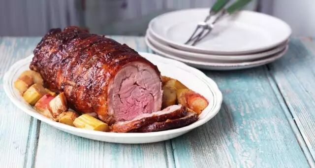 瘦肉粉红色,浅色大理石花纹,脂肪层均匀。因为肉质软嫩,烹饪时间短,适合烤制或烟熏。