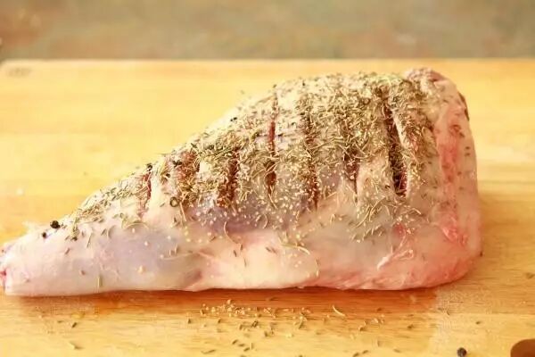 第一步:羊腿洗净,用厨房用纸抹干表面水分,用刀在羊腿表面,每隔3厘米距离切一道口,以便入味,并在表面撒盐。