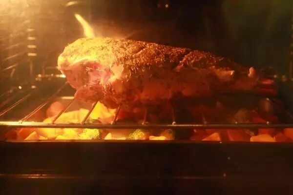 第七步:烤箱预热220摄氏度,将蔬菜烤盘放入烤箱下层,羊腿置于烤架之上放在烤箱中层,在羊腿表面刷一层蜂蜜水,烘烤1个小时15分钟。每隔30分钟左右刷一次蜂蜜水,待表面烘烤上色之后,用锡纸盖住羊腿表面,以防上色太深。