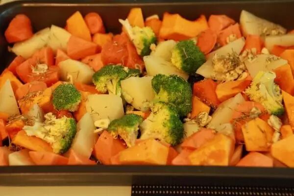 羊腿1只(2公斤),土豆2个,地瓜2个,南瓜1/3个,西兰花1/2棵,胡萝卜1根,盐