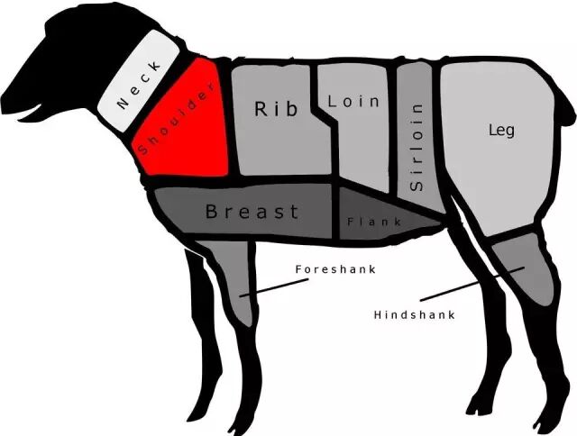 这部分的肉湿润,呈粉红色,有明显的大理石花纹,白色湿润的骨头被结缔组织包裹着,外层有厚肥肉层。通常整块带骨出售或切半出售。超市里常见的羊肉碎多数用这个部分制成。肩部羊儿活动较多,肉质纤维组织丰富,所以适合慢慢焖煮来使肉质变得软嫩。