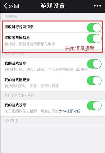 同样是进入微信后,依次点击 【发现】—【游戏】,下拉网页到底,点击页面底部的【游戏管理】图标—然后分别将「接收排行榜赞消息」以及「接收游戏圈消息」关闭即可。