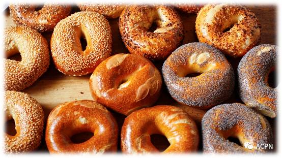 -贝果(Bagel),也称百吉饼,据说是东欧的犹太人发明的,其形状似马蹬,在烘烤之前先用沸水将成形的面团蒸过,经过这道步骤之后贝果就产生一种特殊的韧性和风味,并且会形成特别光亮的外表;可横向中间切开,配以果酱、蛋黄酱、cream cheese、巧克力酱、火腿等食用。