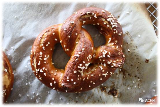 -纽结饼(Pretezl),又称碱水面包,面包师们把面团搓成细长条,提起两端,左右一抖动,潇洒地打个交叉结,然后在碱水中泡上一会儿,中间划上刀口,洒上粗盐,烤成诱人的焦黄色,与冰啤酒搭配,十分惬意。