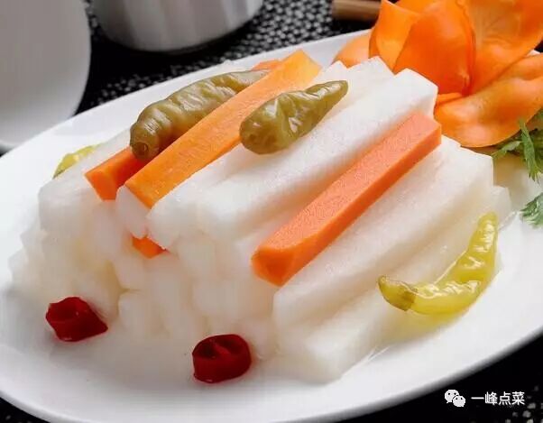 将萝卜削去顶须洗净晾干,然后切成适当的长条,放置室外晾晒至发蔫;将干辣椒、糖、花椒、盐、白酒及白萝卜条拌匀放入坛中,倒入盐水。坛边用水密封保存5天后,即可食用。