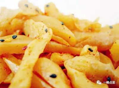 先将萝卜择洗干净,然后加工成3厘米长,宽、厚0.5米的条,晾晒至八成干备用;香油烧热,加入辣椒粉炸至微黄时倒入萝卜干内拌内;将食盐、白糖、花椒、大料放入锅内加水熬开,加入味精,待凉后倒入缸内,与萝卜干拌匀,每天翻动一次,15天左右即为成品,要求呈红黄色。质地筋脆,味道酸辣。