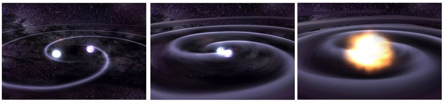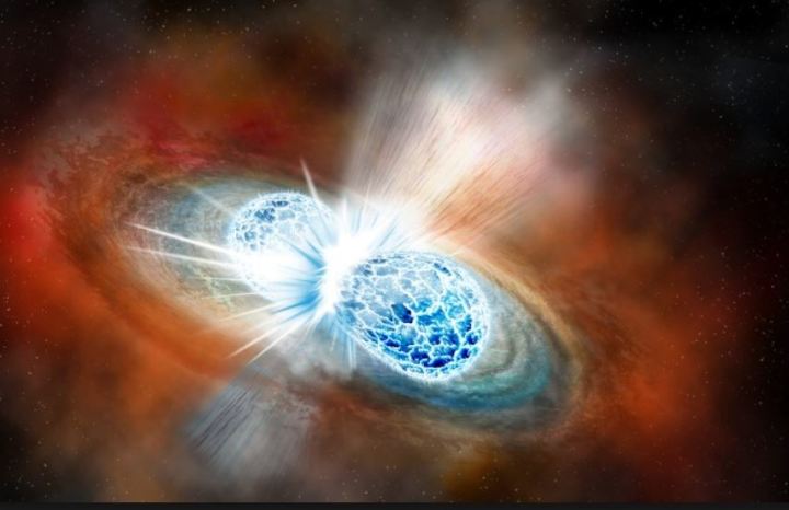 双中子星并合是质量和能量巨大的宇宙事件。两颗中子星互相绕转舞动,越转越近,最后交汇融合,除了迸发伽马暴,还产生亮度达到千倍的“千新星”(kilonova)。不但如此,双中子星并合也产生宇宙中包括金、银等在内的一些重金属元素,它是这些重金属的起源。