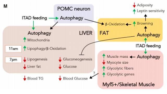 ITAD法诱导的自噬,可以带来一系列有益的代谢改变。对小鼠脂肪组织、骨骼肌、肝脏等多处进行的分析显示,自噬可以发挥将白色脂肪棕色化,增加骨骼肌纤维的数目,促进肝脏的脂质吞噬,抑制肝糖原、脂质的合成等多重作用,且对寿命已达24个月,垂垂老矣的小鼠也有着相似的效果,从而恢复衰老导致的代谢异常,甚至还可起到预防代谢衰退的效果。