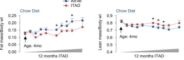 研究人员在小鼠模型上进行的试验显示,如果从小鼠4个月大时开始采取ITAD法喂食,虽然不管是喂普通或是高脂饮食,小鼠进食量都与对照组相近,两组体重也相似,但喂食12个月后,ITAD组的体脂比明显较低,肌肉占比较高,提示小鼠的代谢明显改善。而如果从8个月或18个月开始进行ITAD喂食,则小鼠体重也相对较轻,看来ITAD法还真能改善年龄导致的自噬衰退。