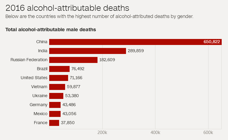 那么这危害有多大呢?数据分析显示,在全球每年因各种原因死去的3200多万人中,喝酒直接导致了280万人的死亡,是第七大致死和致残因素!由于人口众多,中国是全球饮酒致死最多的国家,每年有70万国人把命喝没了(65万是男性)!