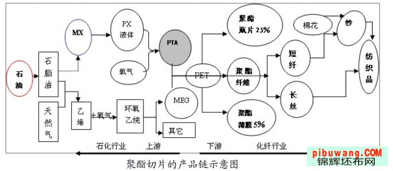 首先是石油--石脑油—二甲苯(mx0)-对二甲苯(px)-精对二甲苯—聚对苯甲酸乙二醇(也就是我们所说的聚酯切片)—它可以直接加工成涤纶长丝,也可以先加工纤维级别的切片做成涤纶短纤。最后就是纺织加工了。