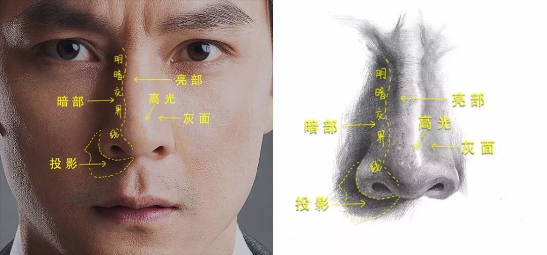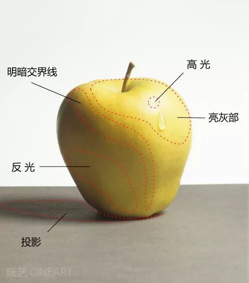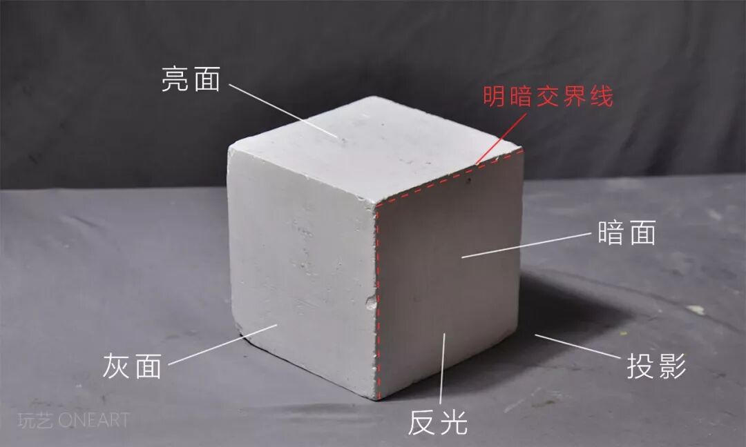 明暗交界线:区分物体亮部与暗部的区域,一般是物体的结构转折处。(明暗交界线不是指具体的哪一条线,它的形状、明暗、虚实都会随物体结构转折发生变化。)