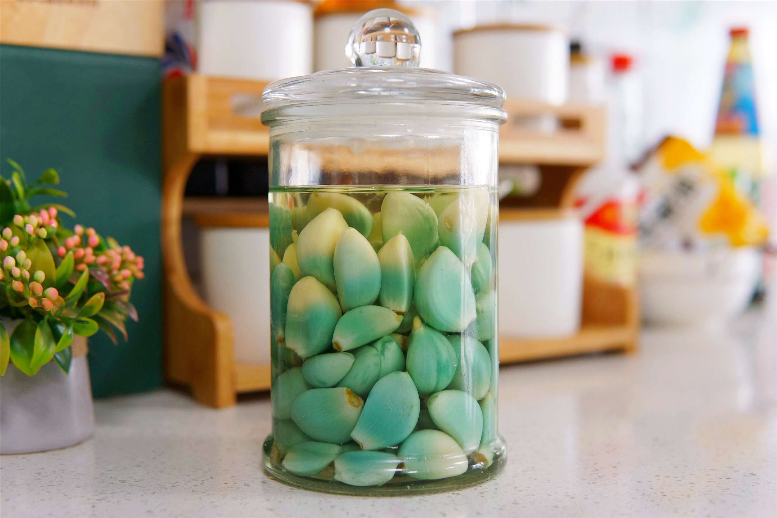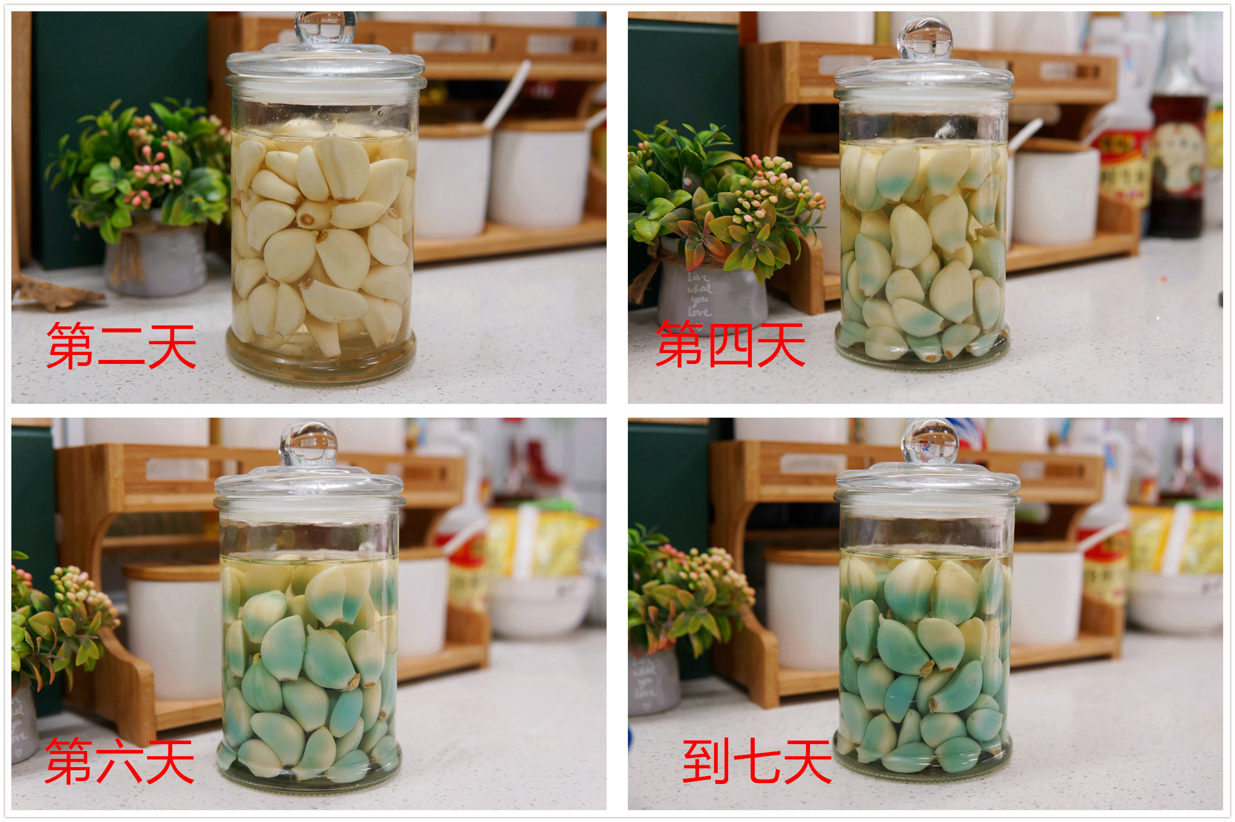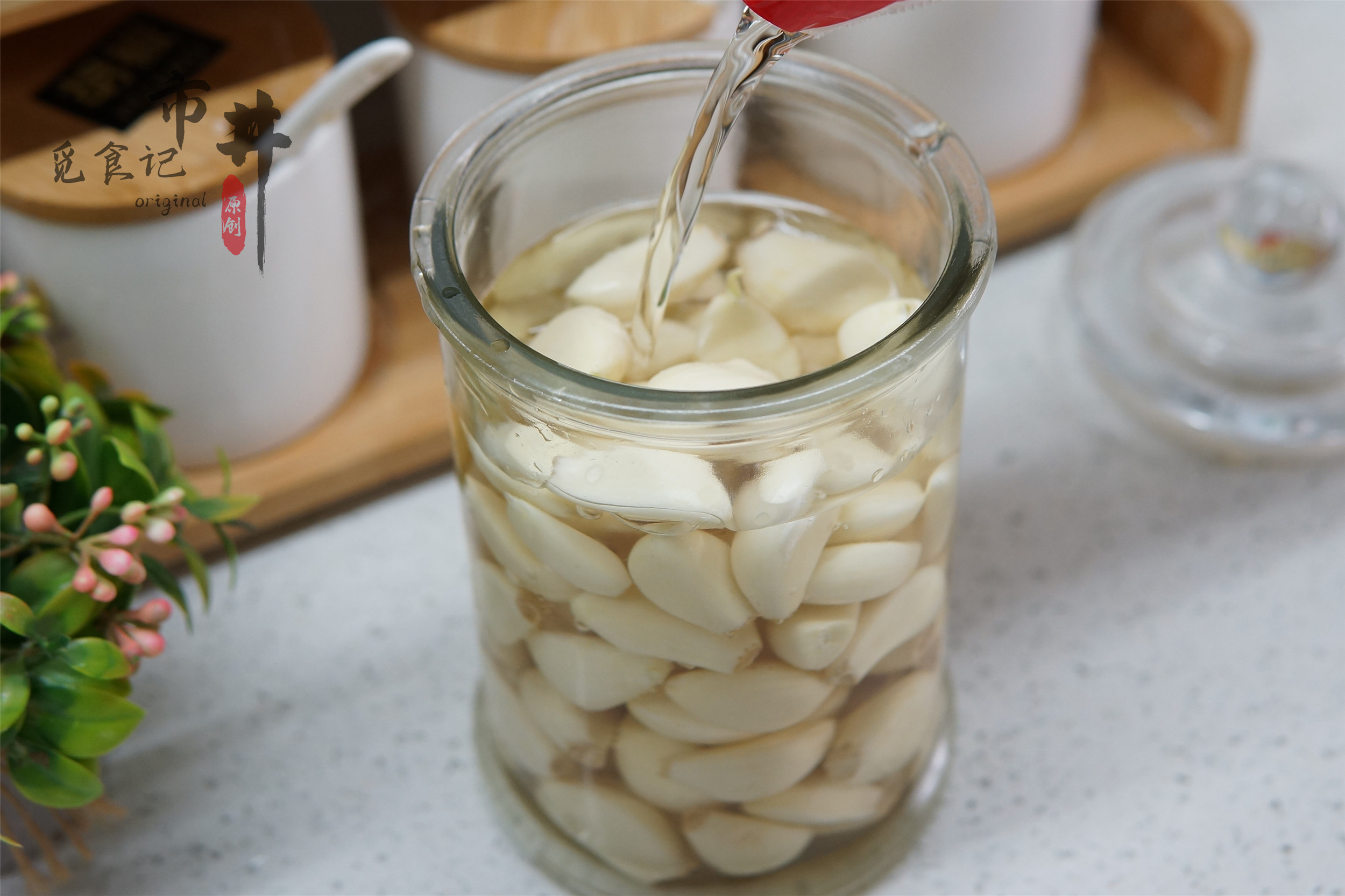 3、将剥好的大蒜放入容器中,加入没过蒜瓣的米醋,盖上盖子密封腌制7天左右,蒜瓣变绿,腊八蒜就算成功了。