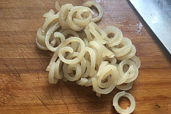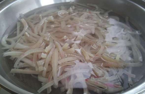 清洗后,猪皮还要放在热水里泡一泡,进一步去掉猪皮中藏着的杂质,记住泡的时候不用冷水,否则效果不好,要用热水泡,才能起到很好的效果,并且猪皮在热水里不会变硬,还是软的,软的猪皮更容易去掉猪毛,也可以很好切。