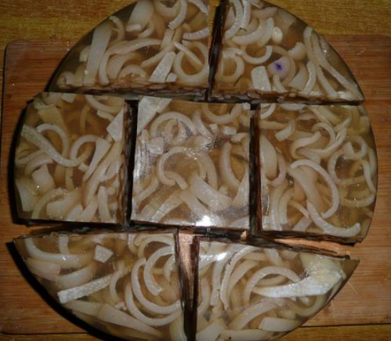 盛出来后,放一段时间,猪皮冻就凝固了,吃的时候切块,调料汁蘸着吃或者浇在猪皮冻上面都好。