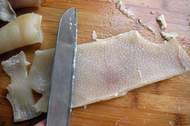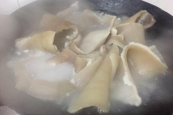先把猪皮放进锅里煮上两三分钟,把猪皮给烫软,再用菜刀将白色部分去掉,去掉之后,用菜刀来回刮几遍,将大部分的油脂清除干净。