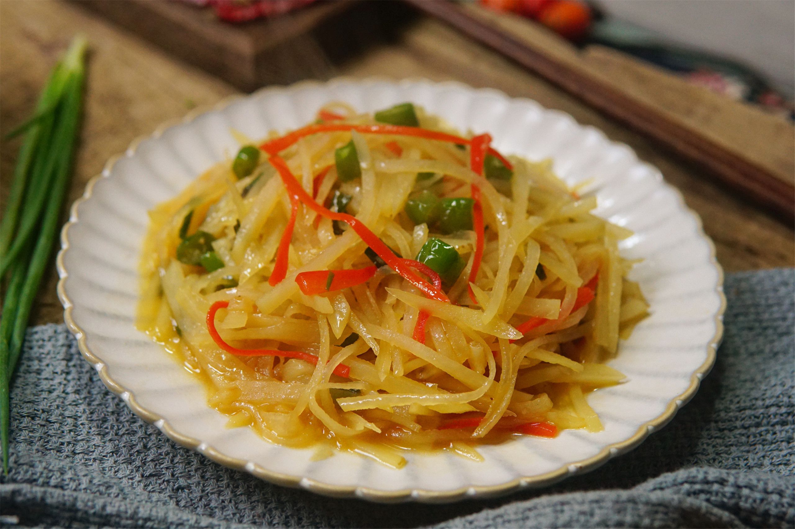 炒土豆丝,可是一道非常好吃的家常菜,很多朋友隔三差五的,也会做这道菜吃,但是看似是道家常菜,它的热量非常高,因为很多朋友在家里炒土豆丝的时候,切好之后焯水就炒啦,这样淀粉残留得比较多,和油炒在一块,非常容易长胖,所以炒土豆丝也是一道令人发胖的家常菜,在减肥时期,如果非要吃,可以把切好的土豆丝放在清水中,淘洗上五遍以上,洗干净淀粉再炒,这样会好很多。