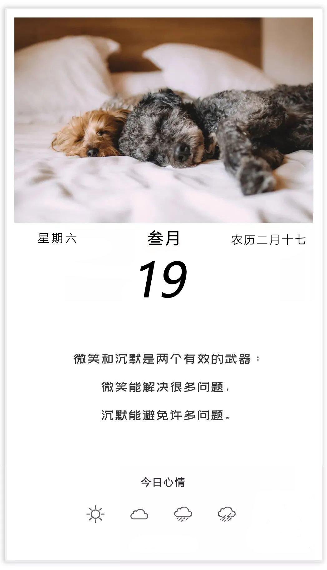 微笑和沉默是两个有效的武器:微笑能解决很多问题,沉默能避免许多问题。早上好,周末!