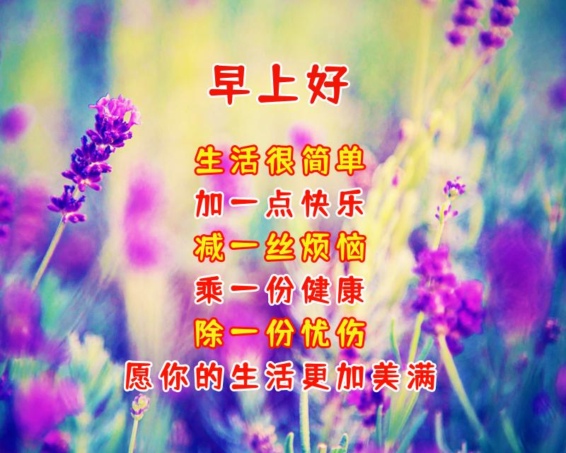 早上好!生活很简单:加一点快乐,减一丝烦恼,乘一份健康,除一份忧伤,愿你的生活在这份加减乘除中,更加美满。幸福,充满希望。