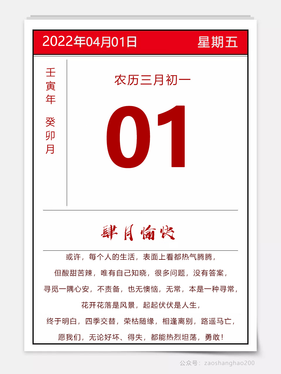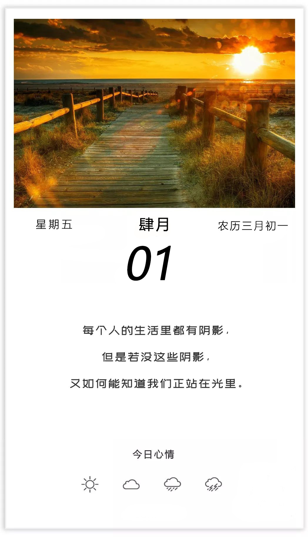 四月你好!让我们删除过去的阴霾和忧伤,轻装上阵,重新起航,让我们风雨同舟,彼此安康,远离病毒,迎接曙光!愿我们在最美的四月天里,平安无恙,幸福安康!三月,共沐风风雨雨;四月,惟愿平平安安!