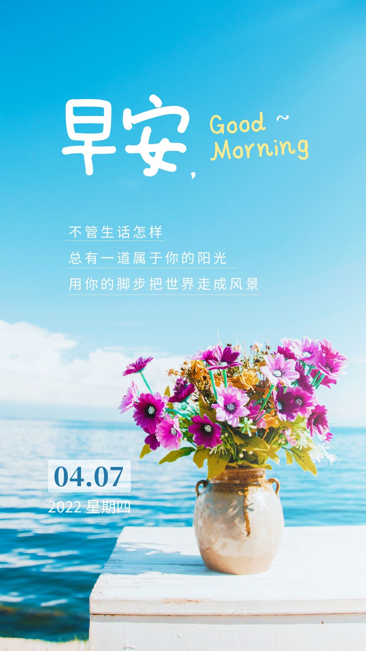 不管生话怎样,总有一道属于你的阳光,用你的脚步把世界走成风景!早安,周四!