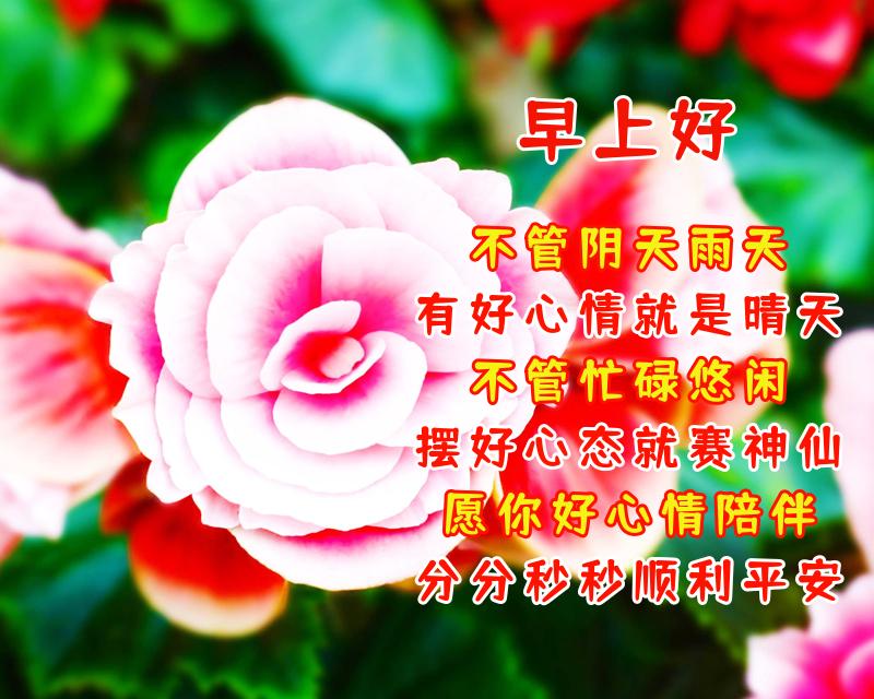 不管阴天雨天,有好心情就是晴天;不管忙碌悠闲,摆好心态就赛神仙;不管复杂简单,绽放笑容就不伤感,又是新的一天,又有好事出现,斗志昂扬向前,争取更好明天,空气透着新鲜,阳光洒下温暖,愿你好心情陪伴,分分秒秒顺利平安,早上好!