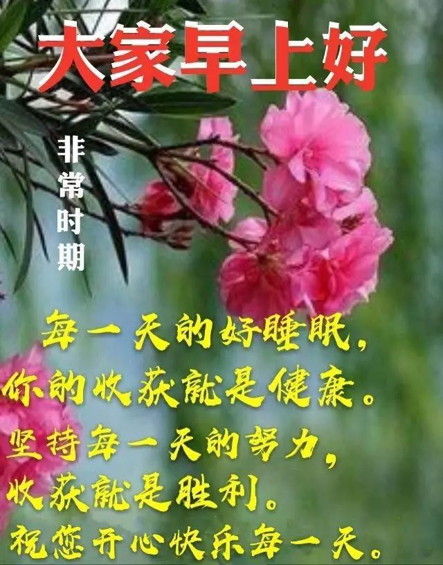 2、坚强的内心,往往会被一句简单的安慰打败,然后泪流满面。得不到的付出,要懂得适可而止。在逆境中看到希望,快乐便是一种心情;在磨难之中感悟快乐,快乐便是一种宽容;在平凡之中发现快乐,快乐便是一种涵养;在曲折之中找寻快乐,快乐便是一种气质;在艰辛中品味快乐,快乐便是一种风度。 星期六,早上开心快乐!
