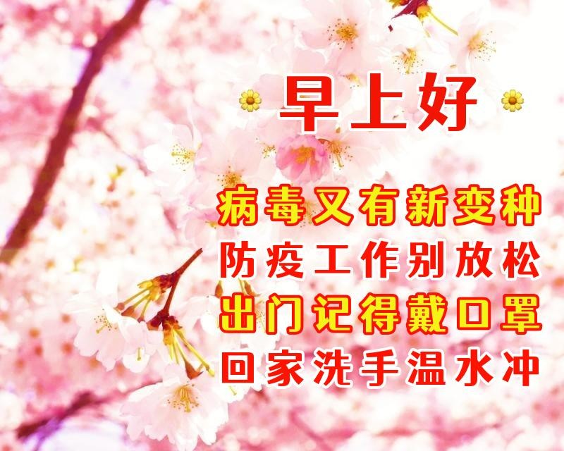 5、病毒又有新变种,防疫工作别放松,出门记得戴口罩,回家洗手温水冲,早上好