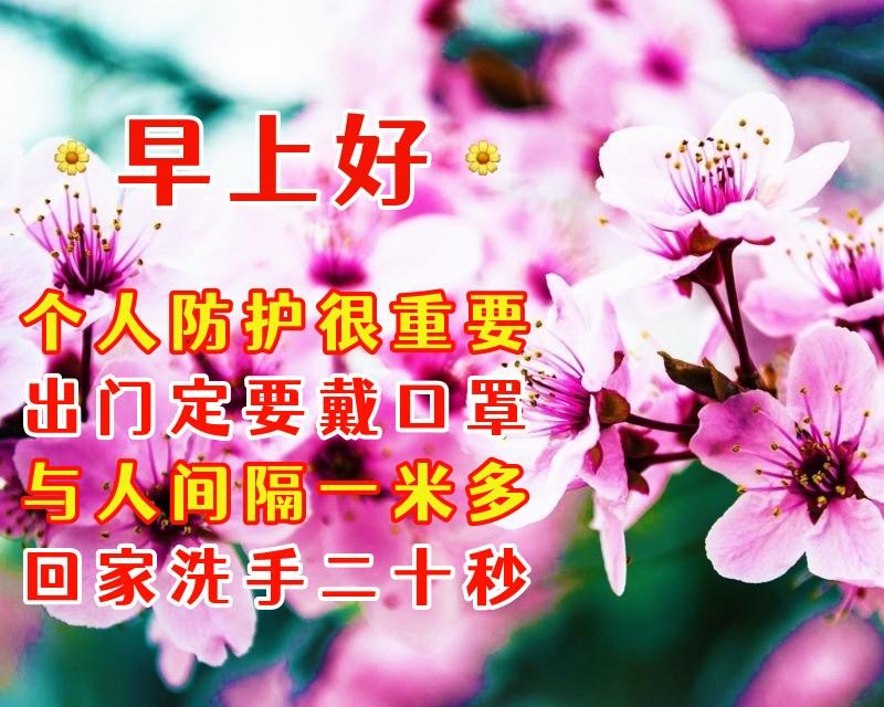 3、个人防护很重要,出门定要戴口罩,与人间隔一米多,回家洗手二十秒,早上好