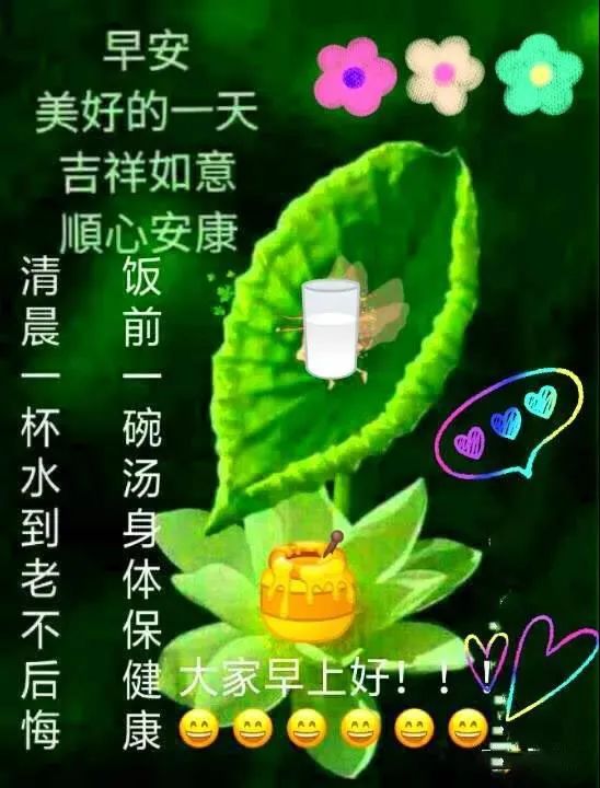 大清早,空气好,早起床,喝些水,排毒养胃精神好;吃早点,很紧要,早餐好,身体棒,吸收营养大功劳!早起的鸟儿有虫吃,早起的人儿有短信瞧:朋友,早安!