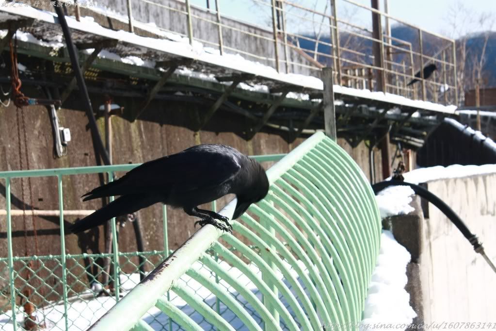 剛被抛出去的熊餅乾就被這只已經在欄杆上虎視眈眈的烏鴉給“劫走”了: