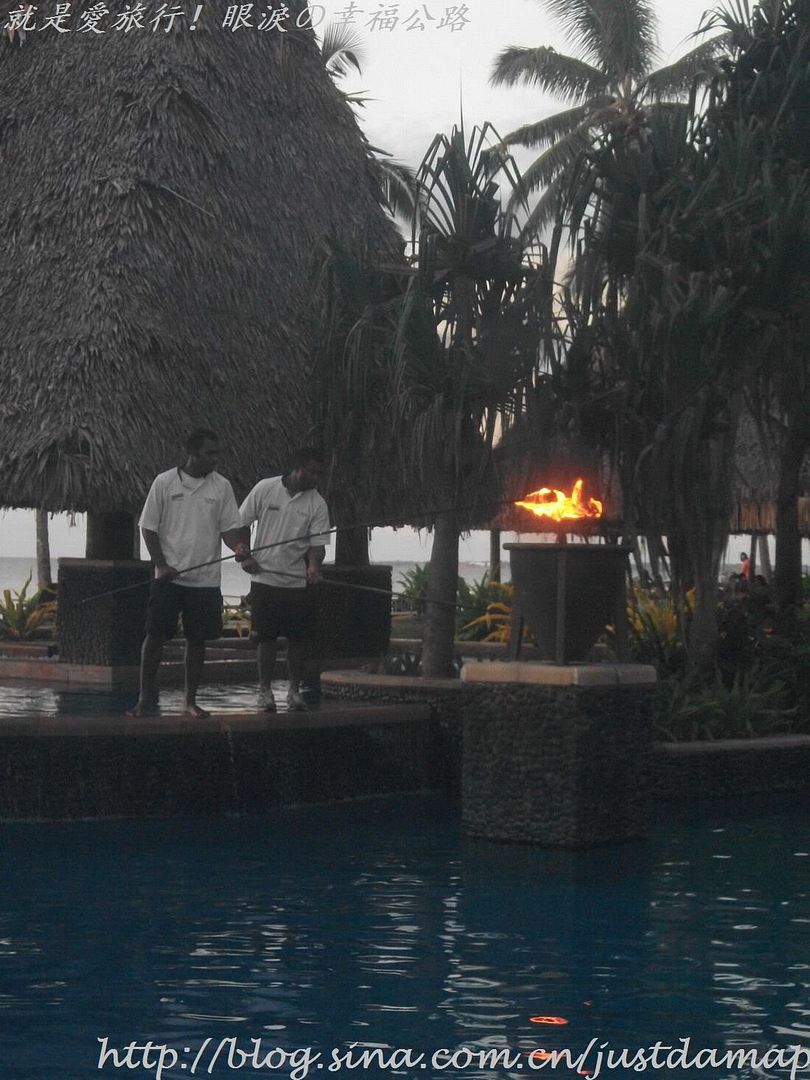 度假村的工作人員就會擧著小伙把,先把泳池周邊的燈點亮了,