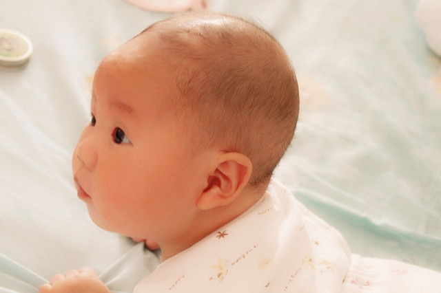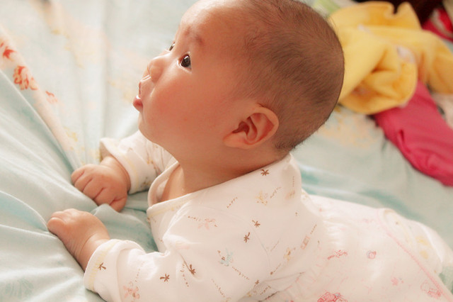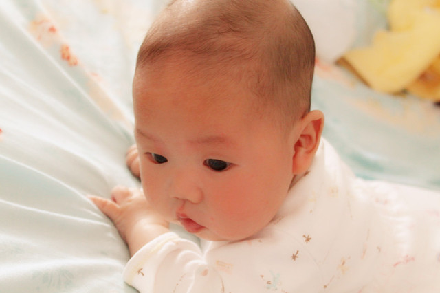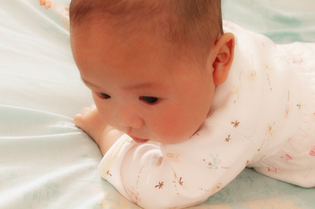 豆豆每天都要洗澡,不管是晴天还是下雨,洗完澡,涂上身体乳给他做抚触操,做完穿上一件内衣,练习翻身,有时候一个,有时候几个,主要看豆豆是否乐意。