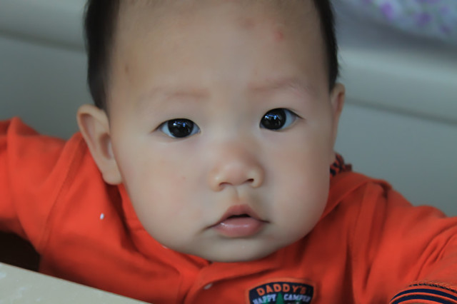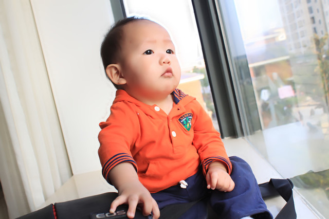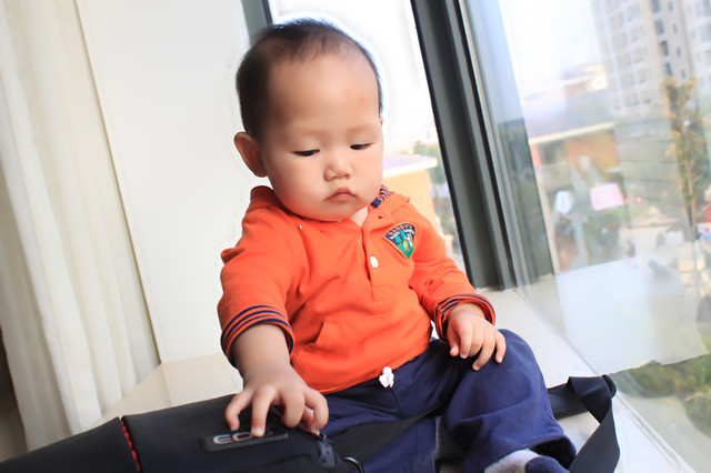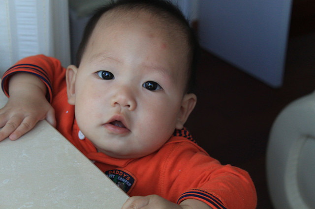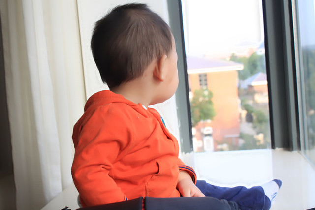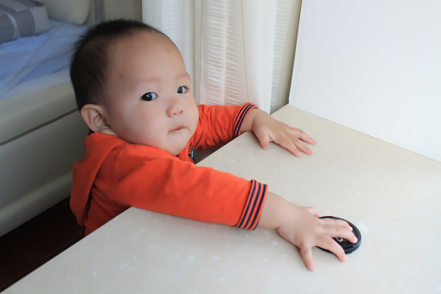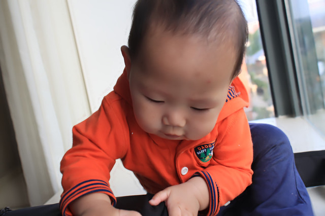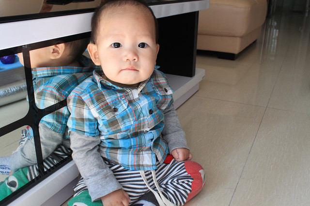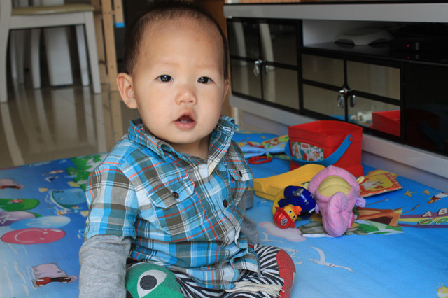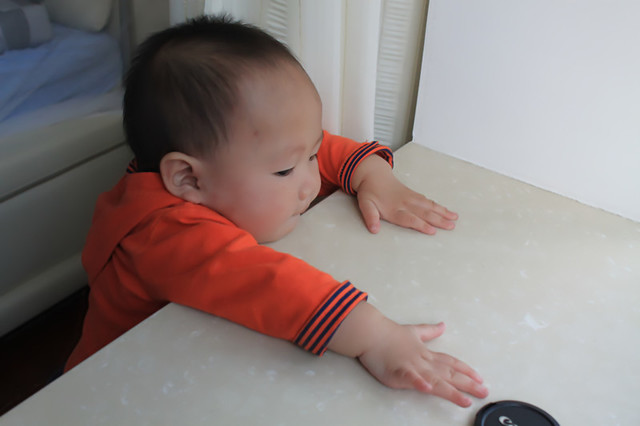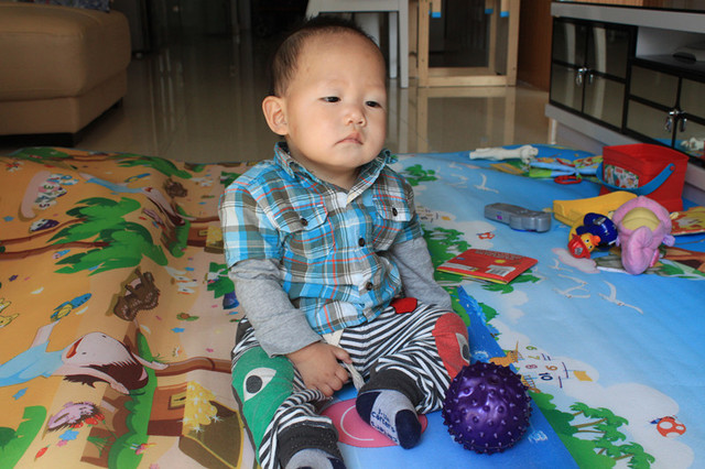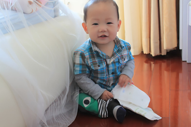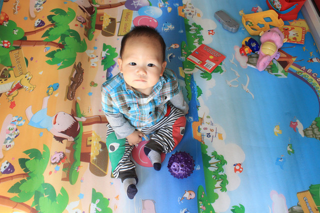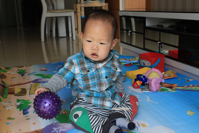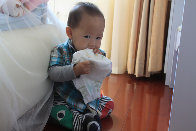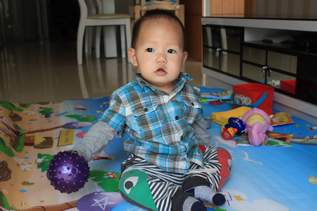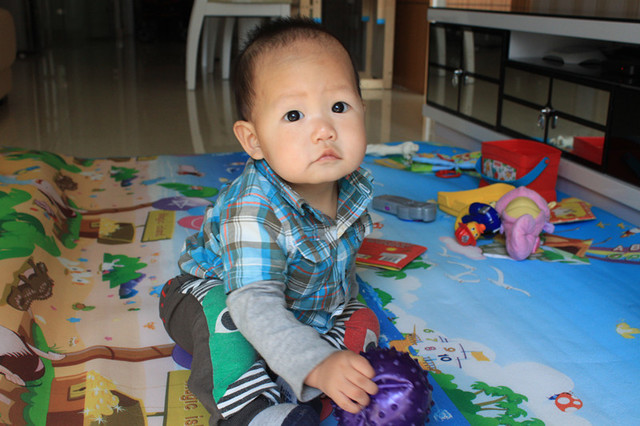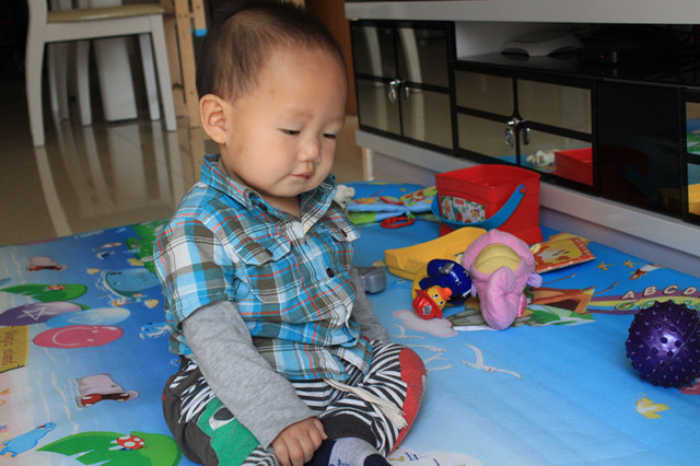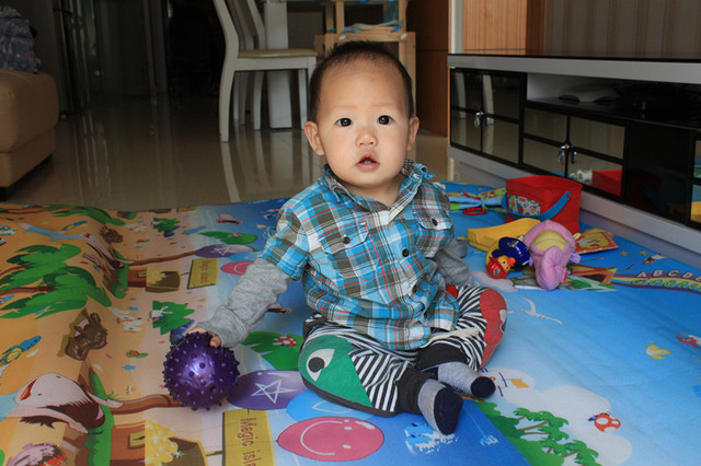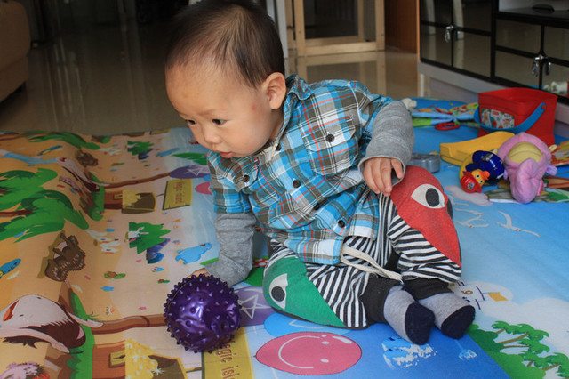 前几天豆豆在客厅玩,公公婆婆陪着,不小心磕到了几次,也是大哭,我在厨房做饭,没有出来安慰,只是听到老人们在说:没关系,不哭。婆婆事后说,我都不出来看看。婆婆自责,自己没有看好小孩。我们安慰她,孩子,都是磕磕碰碰长大的,只要不摔到要害,没事的。这些话,其实也只是安慰她的话。母子连心,每次豆豆哭的时候,我的心也跟着在痛。但是在老人家面前,你表现的越宝贝,也不过是加重他们的内疚和自责,对于以后,他们宁愿抱在手上,也不愿意把他放在地上玩,就是为了怕他磕到了。而这种保护,表面看来是为了孩子好,其实不利于孩子的成长。所以,他们当初刚来,总是听到他们嘴里说,这个不能咬,这个不能碰,不能爬到这里来。我们告诉他们,玩具都是洗干净的,可以咬,如果不能碰,就给他另外一个东西,把这个东西拿走,地上拖的很干净,可以爬。家里的任何角落,都留下过豆豆的足迹,我们能做的,不是保护他不受到任何伤害,紧紧搂在怀里,而是给他一个安全的环境,让他自由爬行,或许这才是他想要的。想起另外一个亲戚的孩子,很少爬,因为怕地上脏,不安全,一直抱在手上。直接会走了,大人谈起,带点骄傲的口吻,不会爬就会走了。任何大动作的发育,每一个孩子都不一样。不会爬直接会走,那不是孩子的特殊能耐,而是,这些动作每个孩子天生就会,到了某一个特定的阶段,即使没有训练,他们也会。但是在他们成长的阶段,本该要做的事情没有做,大概会有点遗憾吧,成长不可逆,爬行的快乐,只有孩子才能体会,长大了,没有哪个正常人会一直在地上爬来爬去。