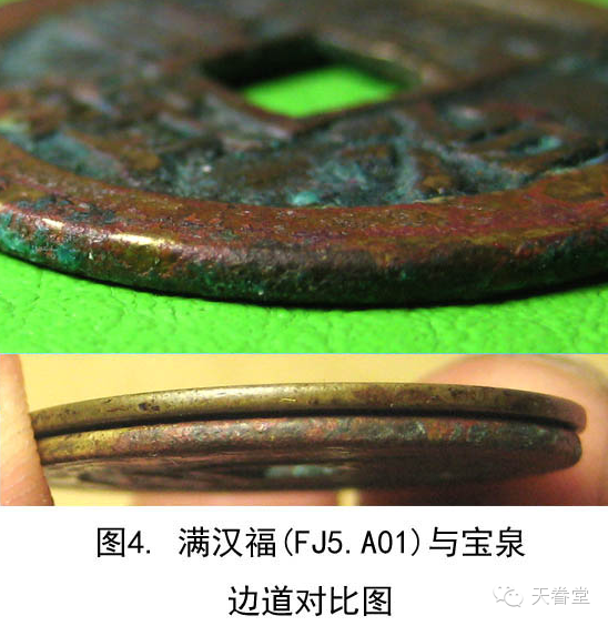 第一枚(FJ5.A01)直径27.1mm,厚1.3-1.4mm,于2000年6月出土于浙江绍兴,乃生坑近未流通品,红斑绿锈,官气十足,极为开门。第二枚(FJ5.A01/2) 1998年发现于江苏常熟,直径26.2mm,厚1.1mm,传世品,钱体熟旧,有长期流通痕迹,被发现时在一发禄之上,现为江苏藏家席桦所藏。第三枚(FJ5.A01/3)是孙仲汇老师《古钱鉴藏趣话》中的那枚,虽已残损但气韵犹在,顺治制钱风格一眼能断。当时孙老师批注:“仅见于此”。上述三枚钱无论从铸造风格还是文字来看,无疑是顺治当朝之物,而且三枚皆为同一个版式,生坑、传世品皆有,可以相互印证,更加证明了顺治满汉福实物的存在。