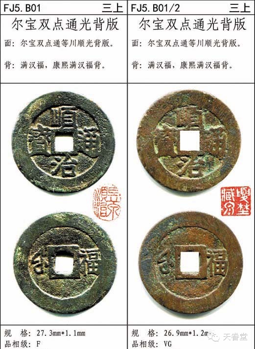 该版第一枚(FJ5.B01)于1999年首次被发现,直径27.1mm厚1.1mm,通体铁壳锈,有流通痕迹甚为开门,其面文来自尔宝双点通光背,背文与康熙满汉福(小福版)风格一致,整体风格也与康熙接近,故推断为康熙年间补铸品,铸造原因待考。 第二枚(FJ5.B01/2)为常州藏家所藏,直径26.9mm厚1.2mm。迄今为止仅见此2枚,十分珍惜。 |