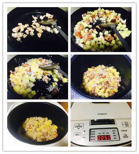 2)锅内入油,油热后放入土豆翻炒两分钟后,放入香菇缕缕翻炒2分钟,再将米入锅炒两分钟