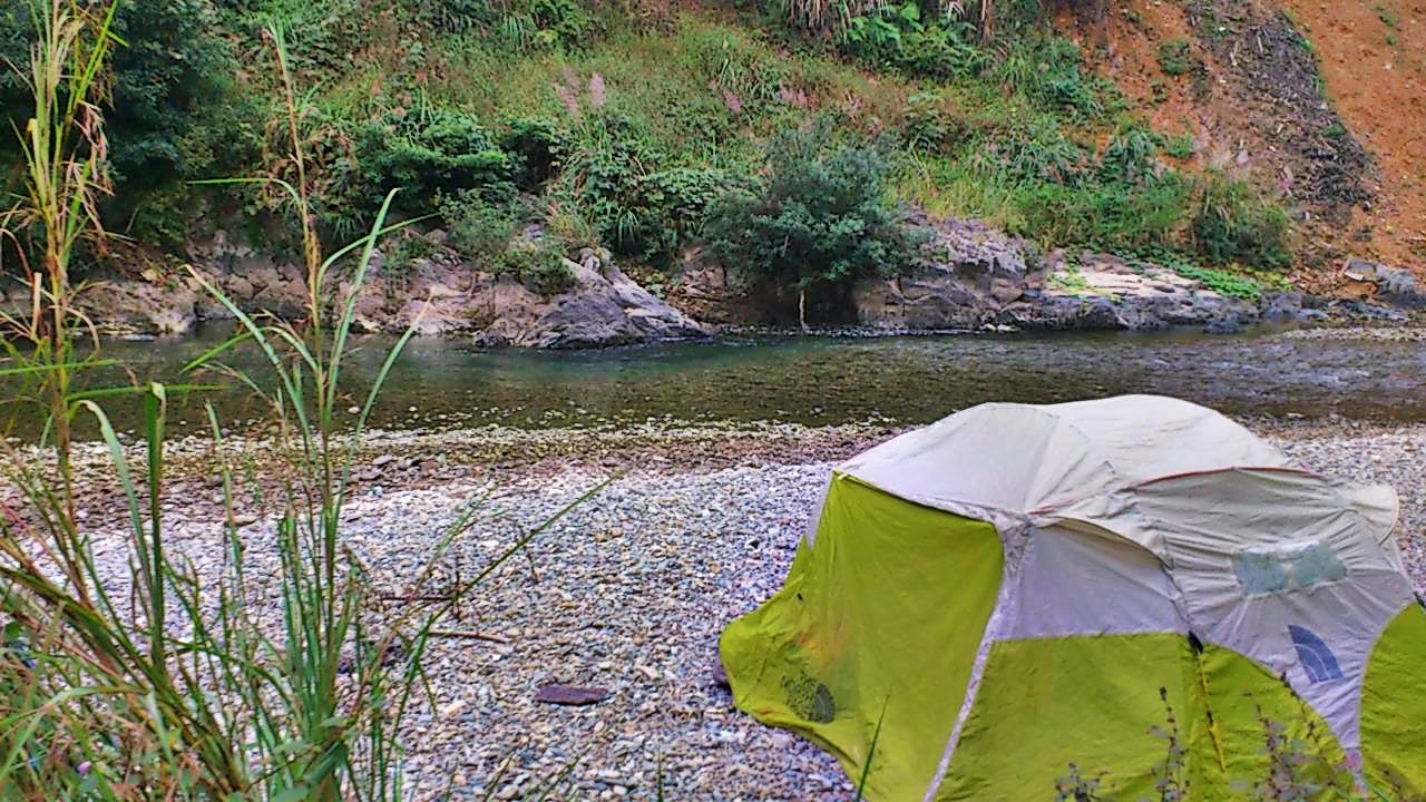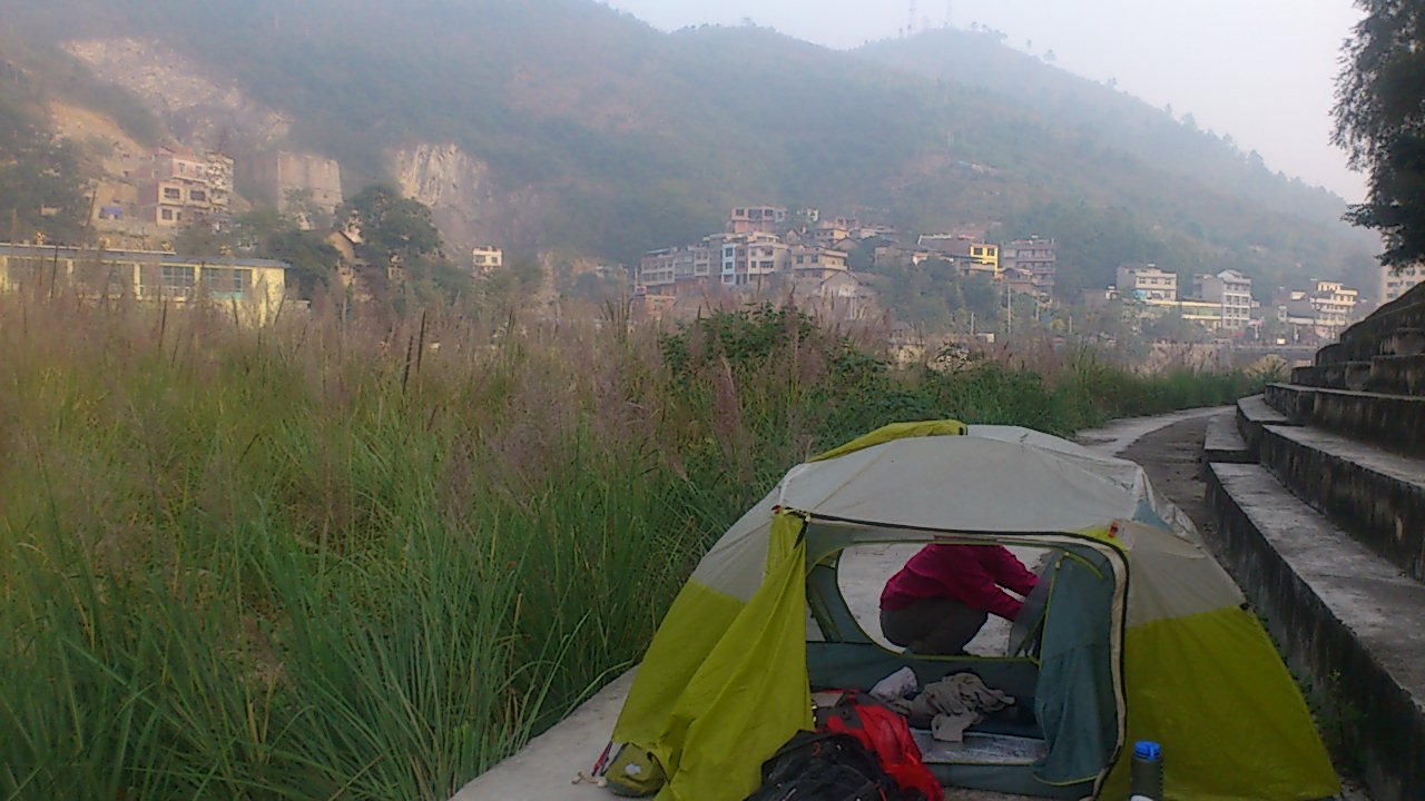 贵州黔南山都县城,夜里在河边找了一个比较安静的地方扎营。在城市地区扎野营心里总觉得会有些危险,所以我们尽量找到一个很少人能看到的地方来过夜,头灯都很少用怕引人注目,到了早上除了偶尔的城管就没人找事了。